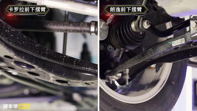 底盘结构方面,两款车的前悬架都是麦弗逊结构,但下摆臂的工艺略有不同。朗逸采用单层冲压的下摆臂,卡罗拉采用的两层焊接式,为了减重,做了不少减重孔。