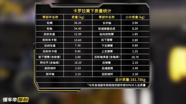 从固有认知出发,多连杆悬架的簧下质量应当是远低于扭力梁的,毕竟一根扭力梁总成的质量基本都要超过20公斤,而一根下摆臂或者一根支撑臂也就是一两公斤。但是在我们仔细核算之后,我们发现了两个问题。第一个问题就是,这些采用后独立悬架的车型,基本都有一个非常厚重的轴承座,卡罗拉单个后轴承座就接近10公斤。而且,这种不与车架或者副车架直接相连的部件,在计算簧下质量的时候是不能打五折的。而扭力梁因为跟车架相连,所以在计入总质量时是可以打五折的。第二点,我们发现扭力梁悬架由于其结构特性,很多部件是可以省掉的。比如说后轮轴承座,轴承可以直接装在扭力梁上,不需要因为布置轴承而额外增加质量。另外,像防倾杆这种部件,扭力梁也不需要,所以最终我们计算出的朗逸的簧下质量是要比卡罗拉轻的。